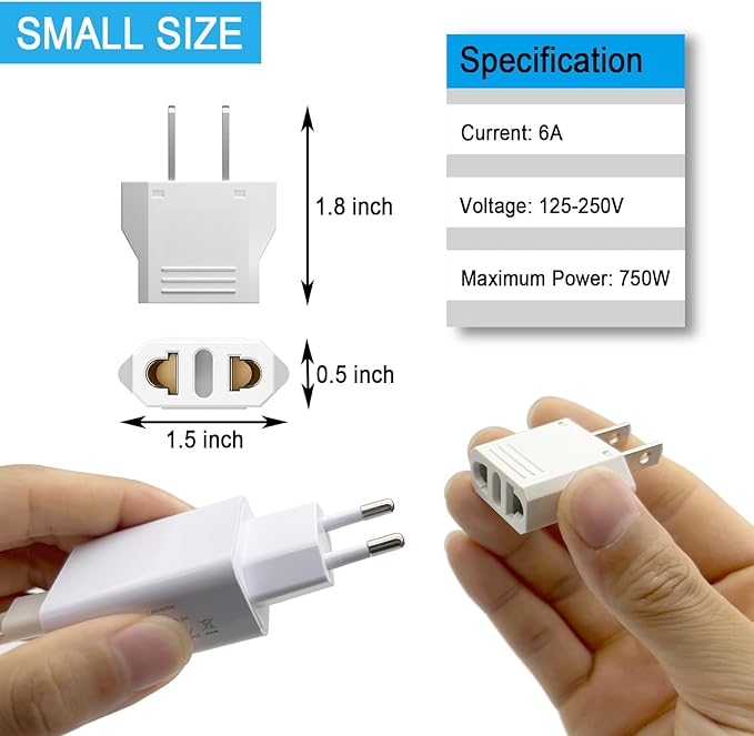 This 220V to 110V plug adapter features a compact and lightweight design, measuring 1.8 inches (height) x 1.5 inches (width) x 0.5 inches (thickness), making it easy to carry and store. It allows high-voltage 220V devices to safely connect to 110V outlets, ensuring stable and secure operation. Supporting a maximum power of 750W, current of 6A, and voltage range of 125-250V, it meets the needs of various household and travel applications. Made with high-quality materials, it offers durable and smooth plug insertion and removal. Ideal for international travel or using devices with different voltage standards, it ensures worry-free power connectivity.-