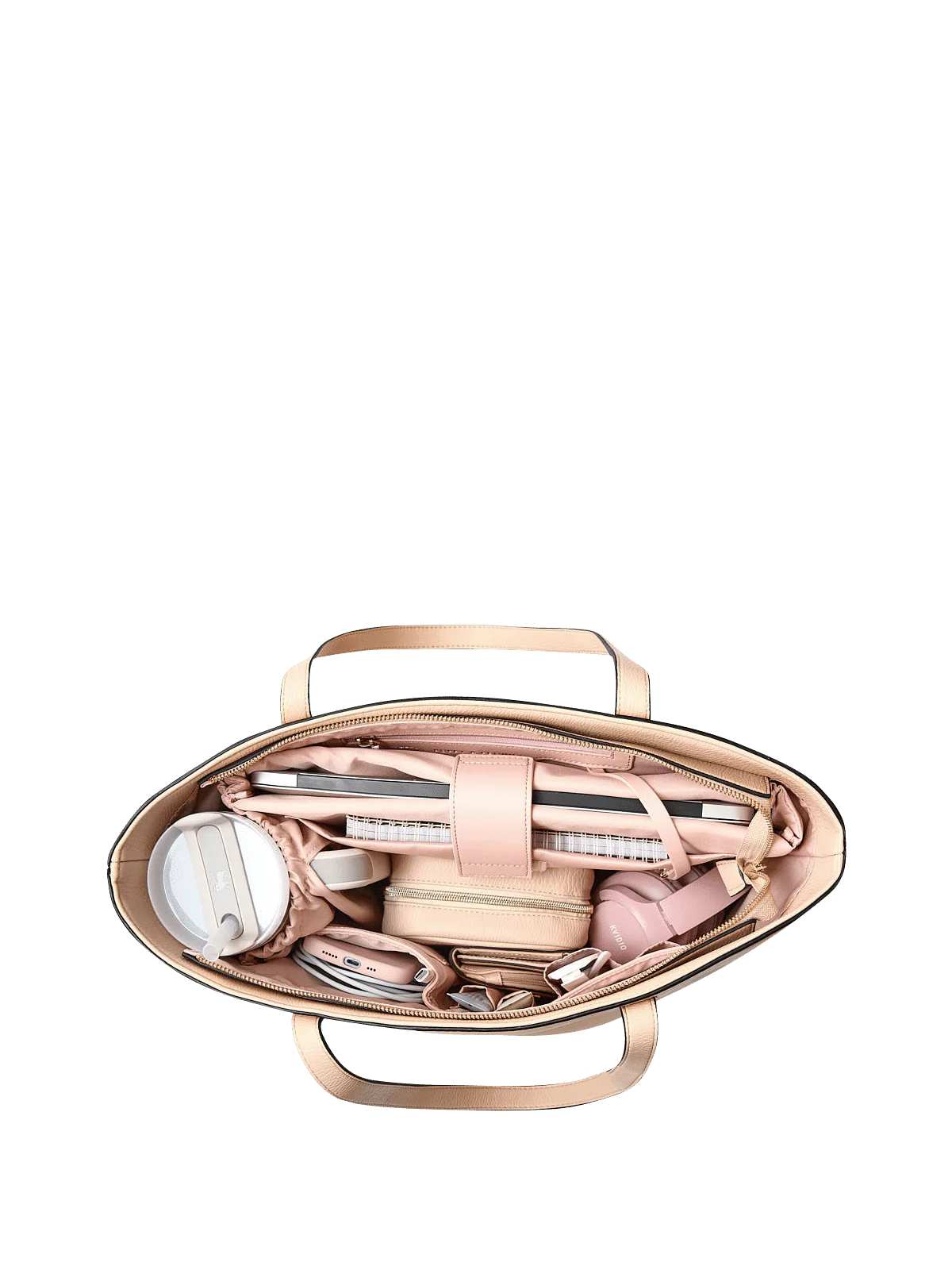 The Go-Getter was designed to carry all of life’s daily essentials with room to spare. Our spacious, all-in-one tote is sleek and sophisticated without compromising on function. Protect your laptop with a stylish, removable 16-inch padded laptop sleeve. Features an interior water bottle pocket, ample interior storage and organization including designated pockets just for lipstick.....yes! The top zip closure will keep your belongings safe and secure and the convenient trolley sleeve makes it easy attach to your luggage so you can navigate the airport with ease.