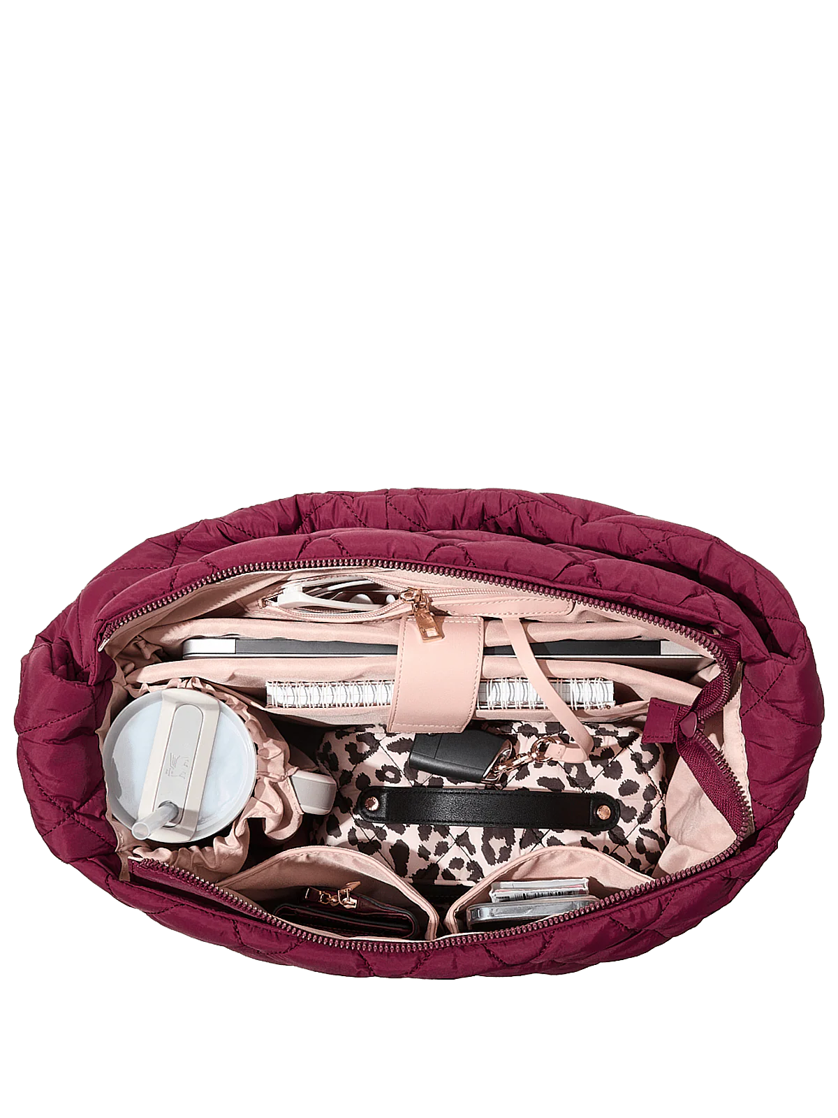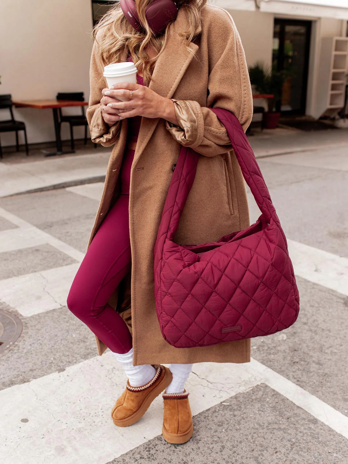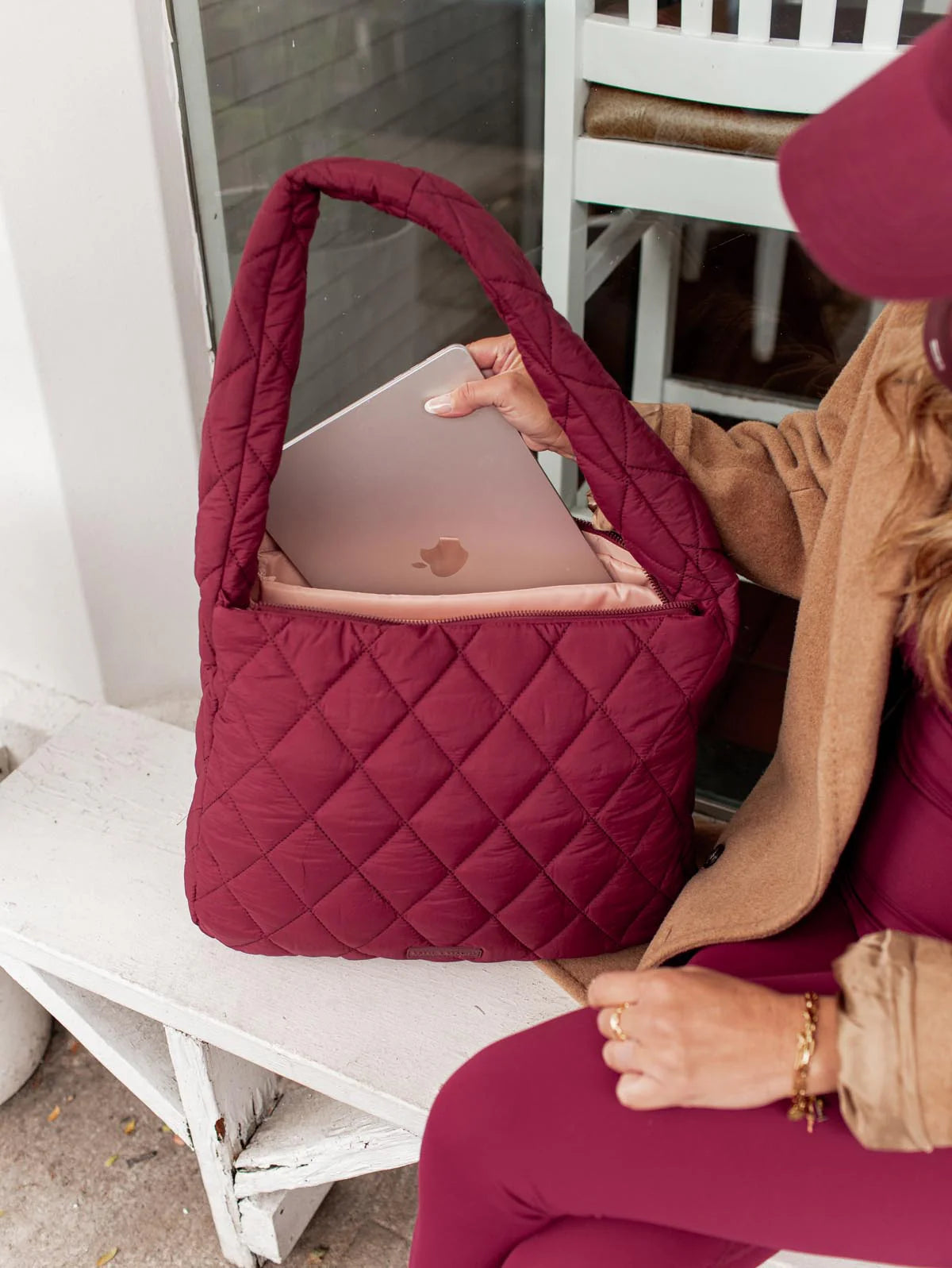 A quilted companion to take you from desk to dinner. Versatile, roomy, and reliable, the Haul It Hobo adapts to whatever the day brings your way. With its ample interior, including a designated pocket for your Stanley tumbler as well as an pocket for a standard water bottle, removable laptop sleeve and interior compartments, the Haul It ensures you'll have room for everything you need. A top zipper closure keeps your necessities where you want them and the back slide pocket gives you easy access to your phone. Crafted in a quilted washed nylon with tonal hardware.