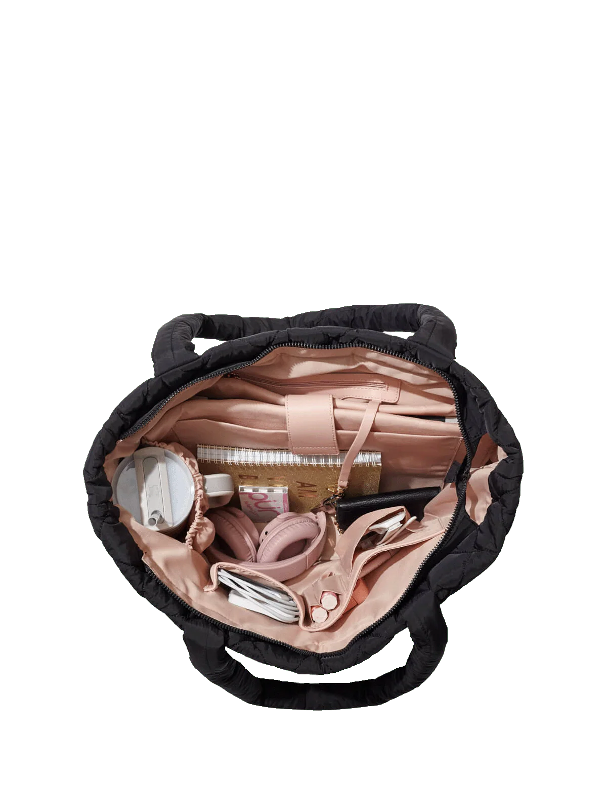 The bigger the bag, the greater the possibilities. From long days at the office to spontaneous weekends away, the plentifully proportioned Tote It is up for anything. Its 16.5 inch laptop sleeve, Stanley water bottle pockets, and key leash make it an ideal all-in-one for your workweek. Out of office? Ditch the laptop compartment for extra space, and use the built-in trolley sleeve to navigate your travel plans with ease. Sneaky side zipper pockets give you even more storage when you need it. Crafted in quilted washed nylon with tonal hardware.
