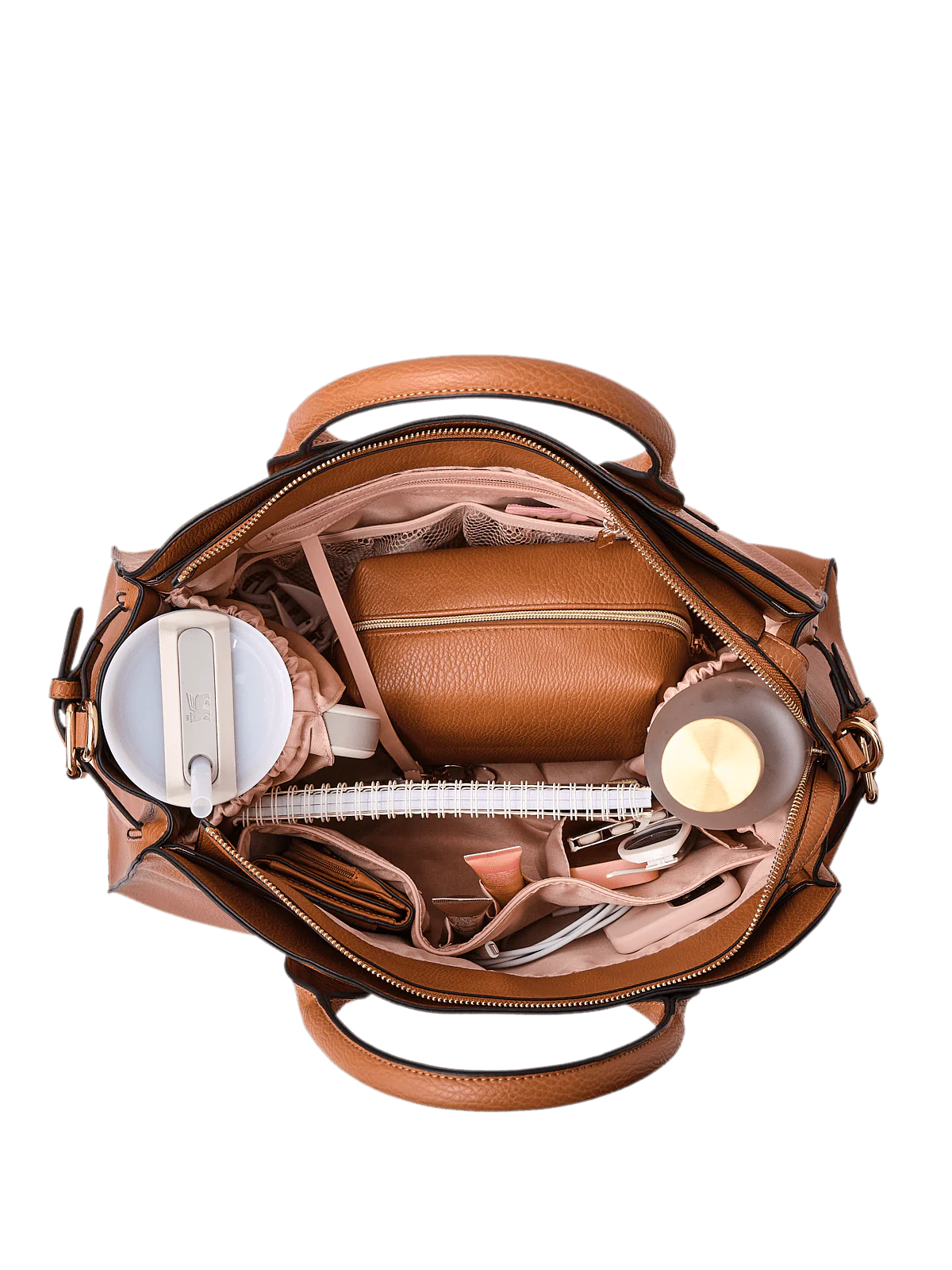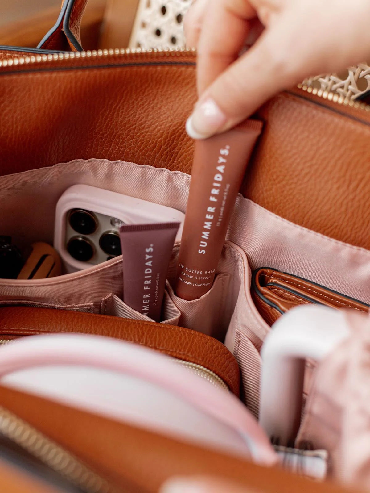 Carry it your way with the removable crossbody strap, by hand, over the shoulder, or hands-free. On travel days, the back trolley sleeve slides over your luggage handle and converts into a slide pocket when not in use. Crafted from soft vegan leather and available in Black, Cognac and Berry.