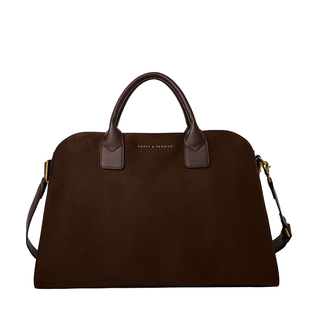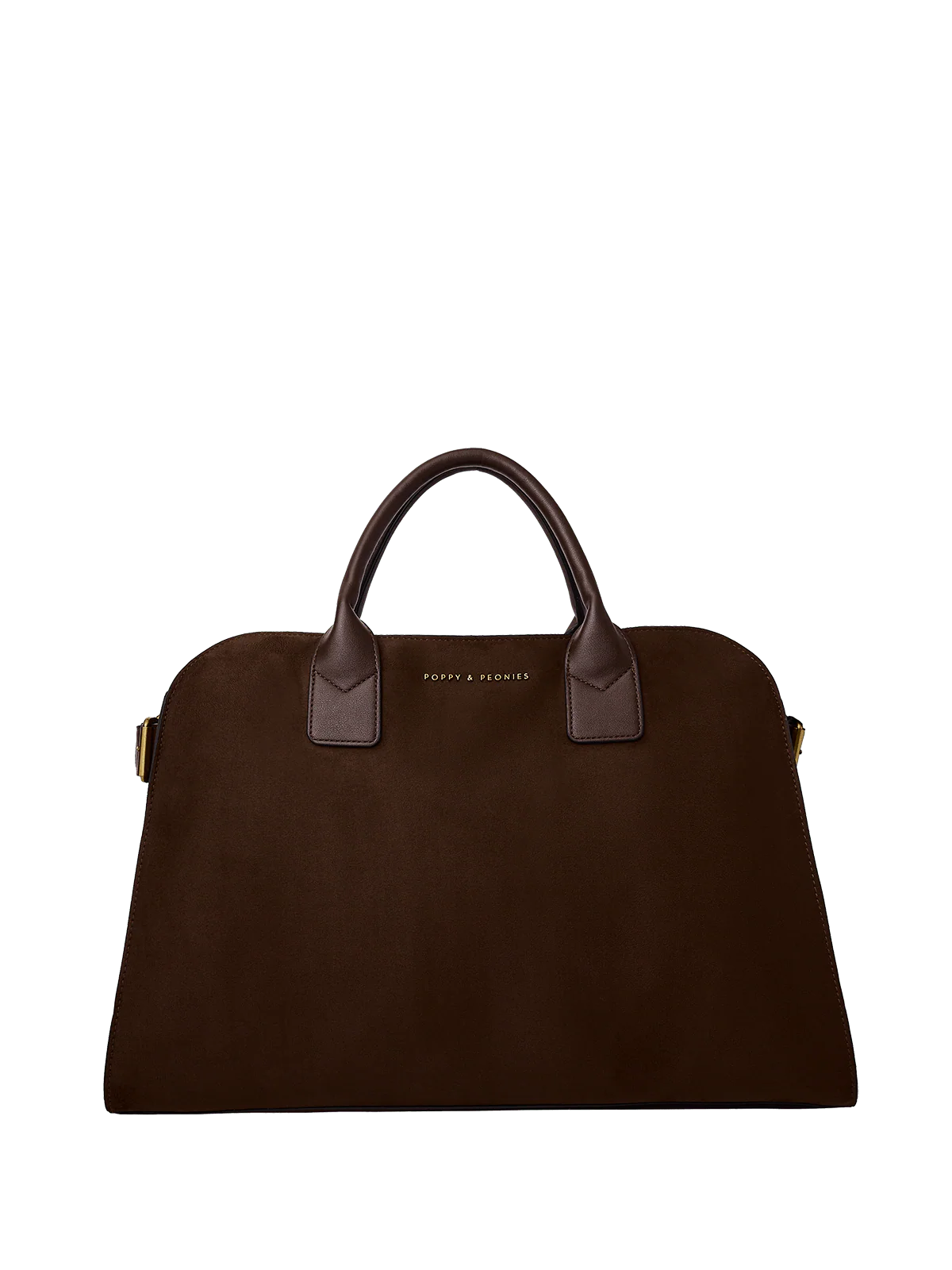 Carry it your way with the removable crossbody strap. On travel days, the back trolley sleeve slides over your luggage handle and converts into a slide pocket when not in use. Crafted from soft vegan suede.