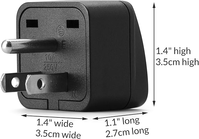 - VERY COMPACT and easy to carry. This travel adapter measures just 1.4" high, 1.4" wide, and 1.1" long. It's lightweight and can easily fit in a pocket or purse with lots of room to spare. It is properly grounded for safety and ideal for US, Canada, Mexico, Japan and anywhere 3 prong grounded Type B is used.